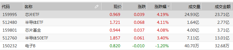 除食品饮料行业外,今日科技股也迎来局部反弹,半导体、芯片等概念重回风口。芯片ETF、半导体ETF、芯片基金等场内基金均涨超4%。消息面上,一季度业绩显示,我国半导体产业基本未受疫情影响。截至4月26日,A股有19家半导体公司披露了一季报,盈利的有15家,净利润同比增长的有16家。