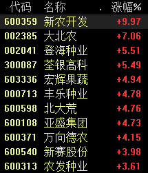 周三早盘,农业股持续上涨,截至发稿,新农开发拉升封板,大北农涨超7%,登海种业、荃银高科涨超5%,宏辉果蔬、北大荒、万向德农等跟涨。