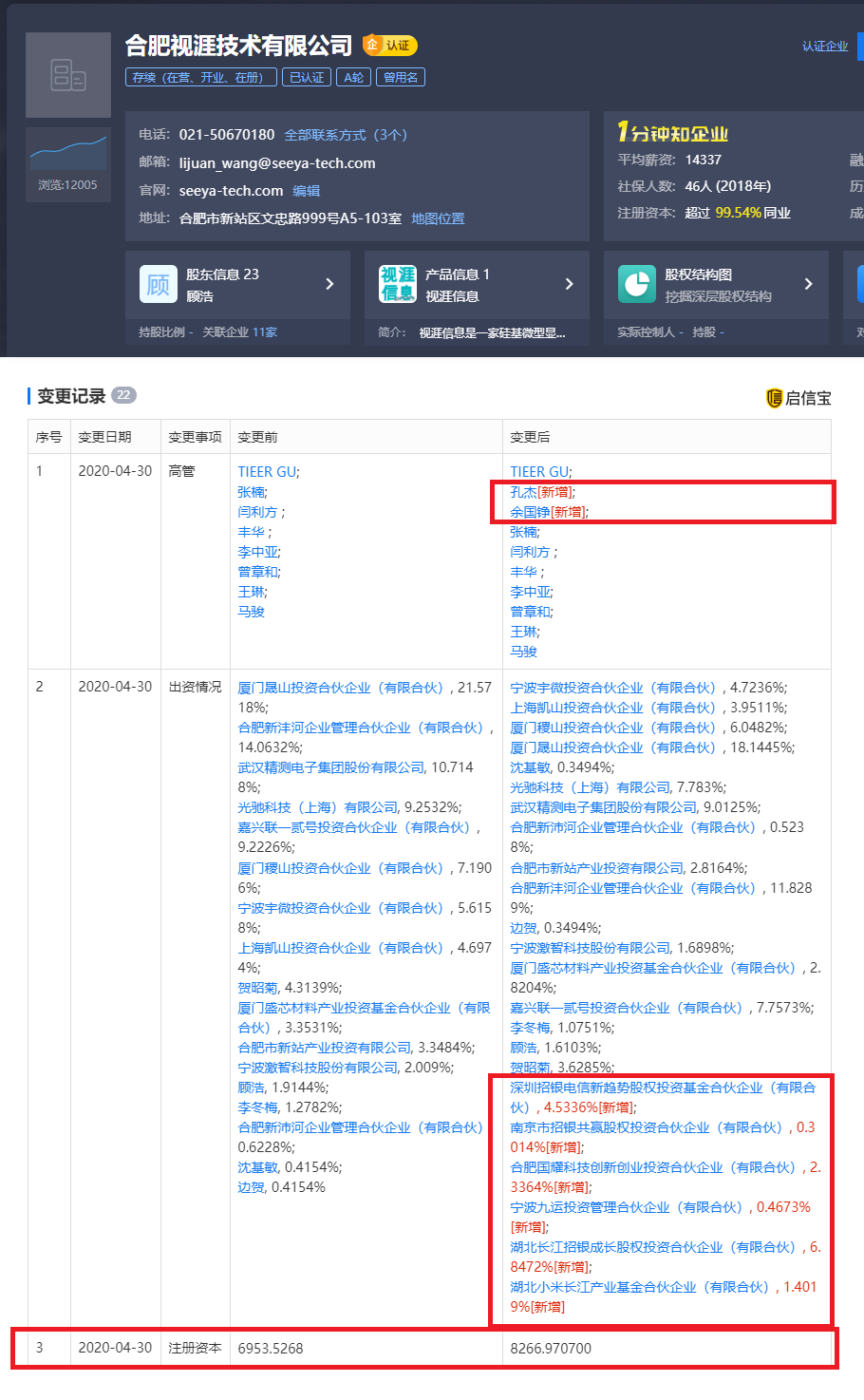启信宝数据显示,4月30日,合肥视涯技术有限公司新增6位股东,其中包括小米,湖北小米长江产业基金合伙企业(有限合伙)投资金额为115.89466万元,持有合肥视涯1.40%的股权。另外新增的股东还有湖北长江招银成长股权投资合伙企业(有限合伙), 深圳招银电信新趋势股权投资基金合伙企业(有限合伙), 合肥国耀科技创新创业投资合伙企业(有限合伙)等。公司注册资本增长至8266.97万元。