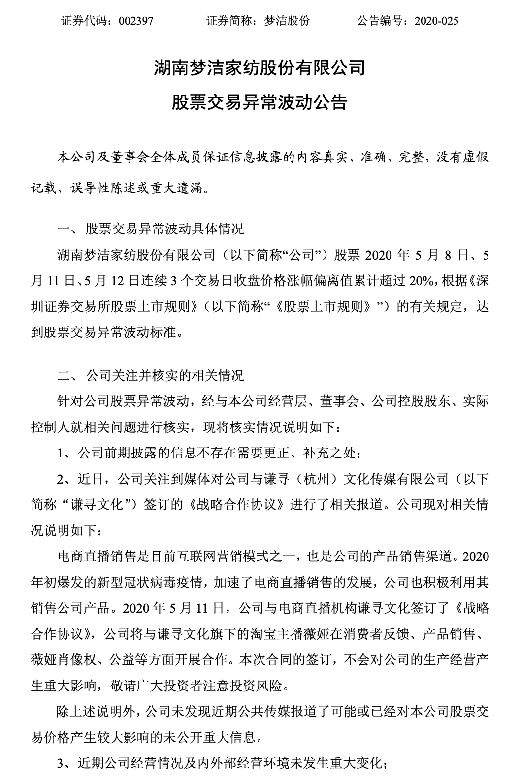 5月12日晚间,梦洁股份发布股票交易异常波动公告称,电商直播销售是目前互联网营销模式之一,也是公司的产品销售渠道。11日,公司与电商直播机构谦寻文化签订战略合作协议,公司将与谦寻文化旗下的淘宝主播薇娅在消费者反馈、产品销售、薇娅肖像权、公益等方面开展合作。此次合同的签订,不会对公司生产经营产生重大影响。