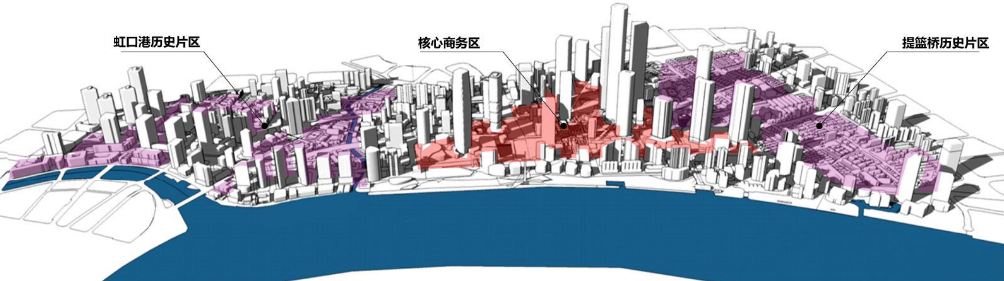 北外滩新一轮规划将在定位上牢牢把握“新时代都市发展新标杆”的目标内涵,在功能上牢牢把握“核心功能重要承载地”的主攻方向,在理念上牢牢把握“新发展理念实践区”的根本要求,形成“一心两片、新旧融合”总体格局。一心,即中部核心商务区,为高强度、高密度开发地区;两片,即西部虹口港活力片区和东部提篮桥片区,为低层高密度空间格局;全域构建新旧融合、以人为本的公共空间网络。