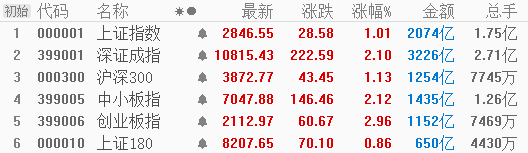 截至收盘,沪指上涨1.01%,报2846.55点;深成指上涨2.10%,报10815.43点;创业板指上涨2.96%,报2112.97点,两市全天成交合计5300.57亿元。