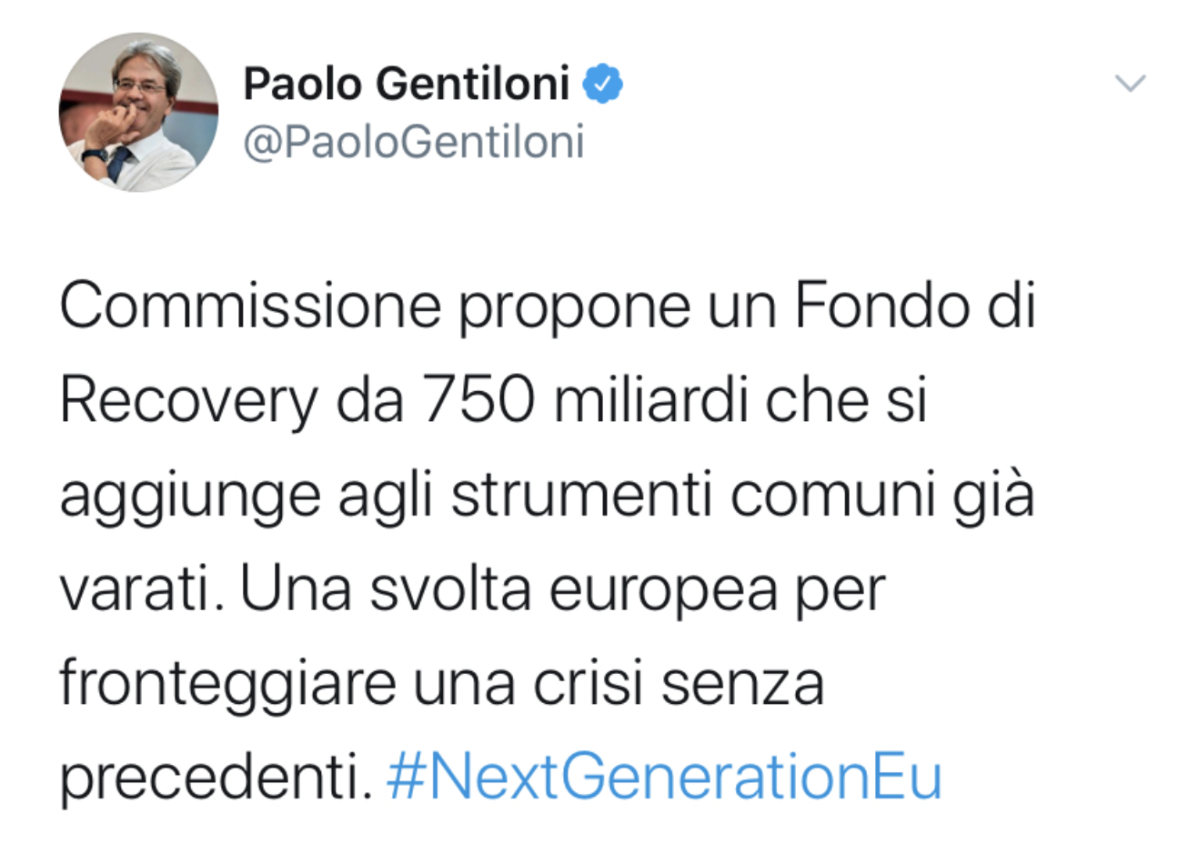 保罗·真蒂洛尼在社交网络上宣布:欧委会提议设立7500亿欧元经济复苏基金