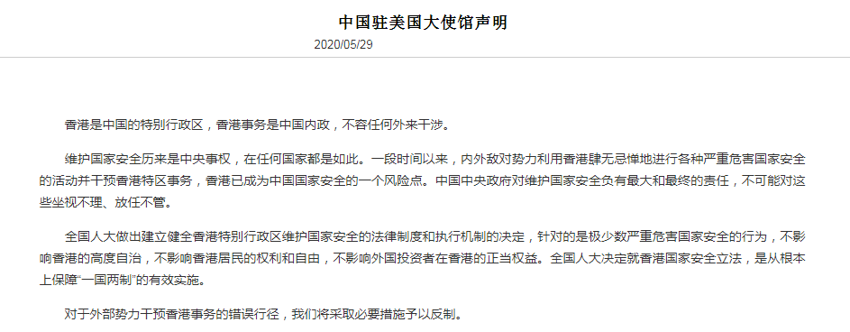 5月29日,中国驻美大使馆发布声明称,香港是中国的特别行政区,香港事务是中国内政,不容任何外来干涉。