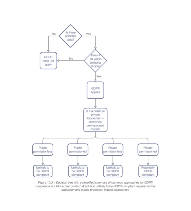 另一个关键问题在于区块链的GDPR合规问题,即如何使用区块链进行GDPR的数据隐私保护。欧盟法律GDPR于2018年生效,旨在让个人对自己的个人数据有更多的控制权——个人数据是指与已识别或可识别自然人相关的数据。而这也对区块链网络在欧盟内外的新合规义务提出了质疑。