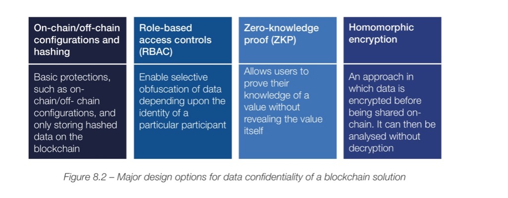 目前,针对数据保护有很多技术解决方案。例如链上、链下哈希配置(对数据进行加密的基础保护),基于角色的准入控制(Role-based access contol,RBAC,可根据特定参与方的身份,对数据进行选择性的混淆处理),零知识证明(ZKP,允许使用者证明他们对于一项价值的认知,但同时可以不暴露该价值本身),同态加密(这一技术能使得数据在链上共享前就已被加密,因此无需后续解密也能进行数据分析)。