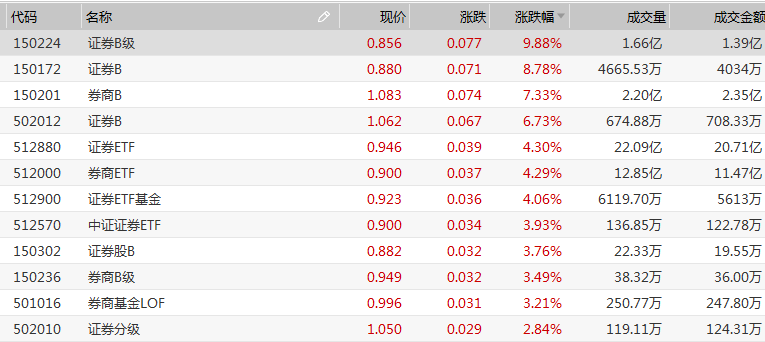 5月29日,上交所发文表示,适时推出做市商制度,研究引入单次T+0交易,保证市场的流动性等。T+0消息自上周末以来持续发酵,有分析表示,若T+0交易制度得以实施,将对券商产生重大利好。受此消息影响,券商板块今日开盘大涨,场内证券主题基金也同样大幅上涨。其中,证券B级(150224.SZ)涨幅近10%,证券B(150172.SZ)涨幅超8%,券商B(150201.SZ)涨幅超7%。