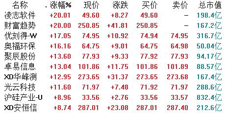涨幅方面,财富趋势(688318.SH)涨停封板,凌志软件(688588.SH)也一度触及涨停。此外,优刻得(688158.SH)、奥福环保(688021.SH)也涨逾16%,聚辰股份(688123.SH)、卓易信息(688258.SH)、华峰测控(688200.SH)、光云科技(688365.SH)纷纷跟涨,涨幅均逾10%。