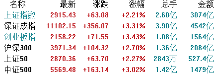 截至收盘,沪指上涨2.21%,报2915.43点;深成指上涨3.31%,报11102.15点;创业板指上涨3.43%,报2158.22点,两市全天成交合计7615.86亿元。