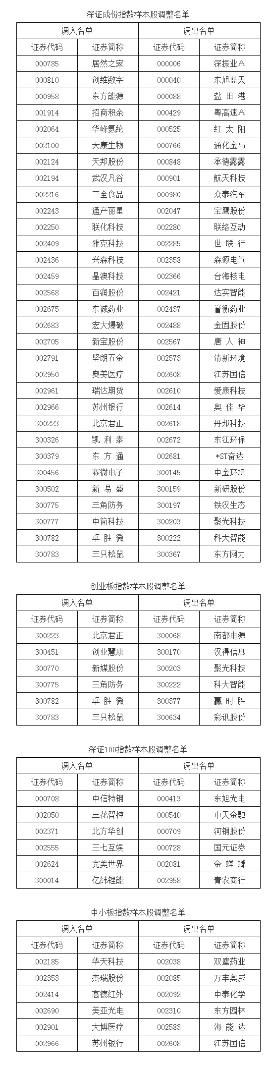 根据指数编制规则,深圳证券交易所和深圳证券信息有限公司决定于2020年6月15日对深证成指、创业板指、深证100等指数实施样本股定期调整。部分指数样本股调整名单见下表,其他深证指数样本股调整名单参见国证指数网(www.cnindex.com.cn)。