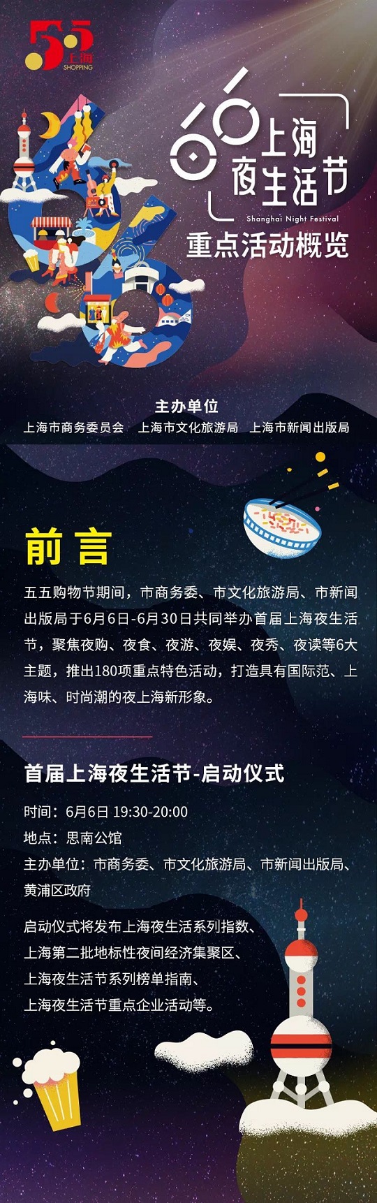华源表示,将于6月6日启动的首届上海夜生活节,计划围绕“夜购、夜食、夜游、夜娱、夜秀、夜读”等主题,推出上海酒吧节、深夜食堂节、深夜书店节、购物不眠夜、夜上海LIVE秀等180余项特色活动,打造具有烟火气、上海味、时尚潮、国际范的夜上海新形象。
