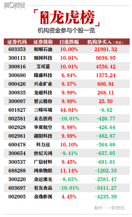 当天机构净买入前三只股票分别是和顺石油、顺网科技、艾可蓝,净买入金额分别为2.20亿元、9039万元、4556万元。