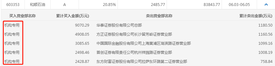 从详细数据看,机构今日净买入最多的和顺石油有5家机构买入,合计净买入金额2.20亿元。