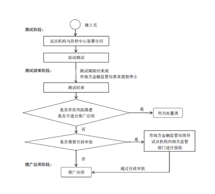 三是明确测试项目的准入、运行、结束及后续管理工作机制。《实施意见》在项目准入环节设置了测试项目“负面清单”、专家评审等工作制度。测试项目经专家组评审通过,申报机构与防控中心签署相关合同后,即进入项目测试阶段,在测试过程中由防控中心对测试项目的运行情况进行实时监控。