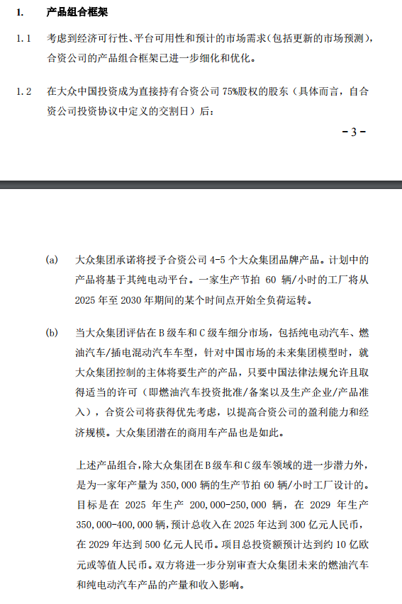 此外,公告表示,当大众集团评估在B级车和C级车细分市场,包括纯电动汽车、燃油汽车、插电混动汽车车型,针对中国市场的未来集团模型时,就大众集团控制的主体将要生产的产品,只要中国法律法规允许且取得适当的许可,合资公司将获得优先考虑,以提高合资公司的盈利能力和经济规模。大众集团潜在的商用车产品也是如此。
