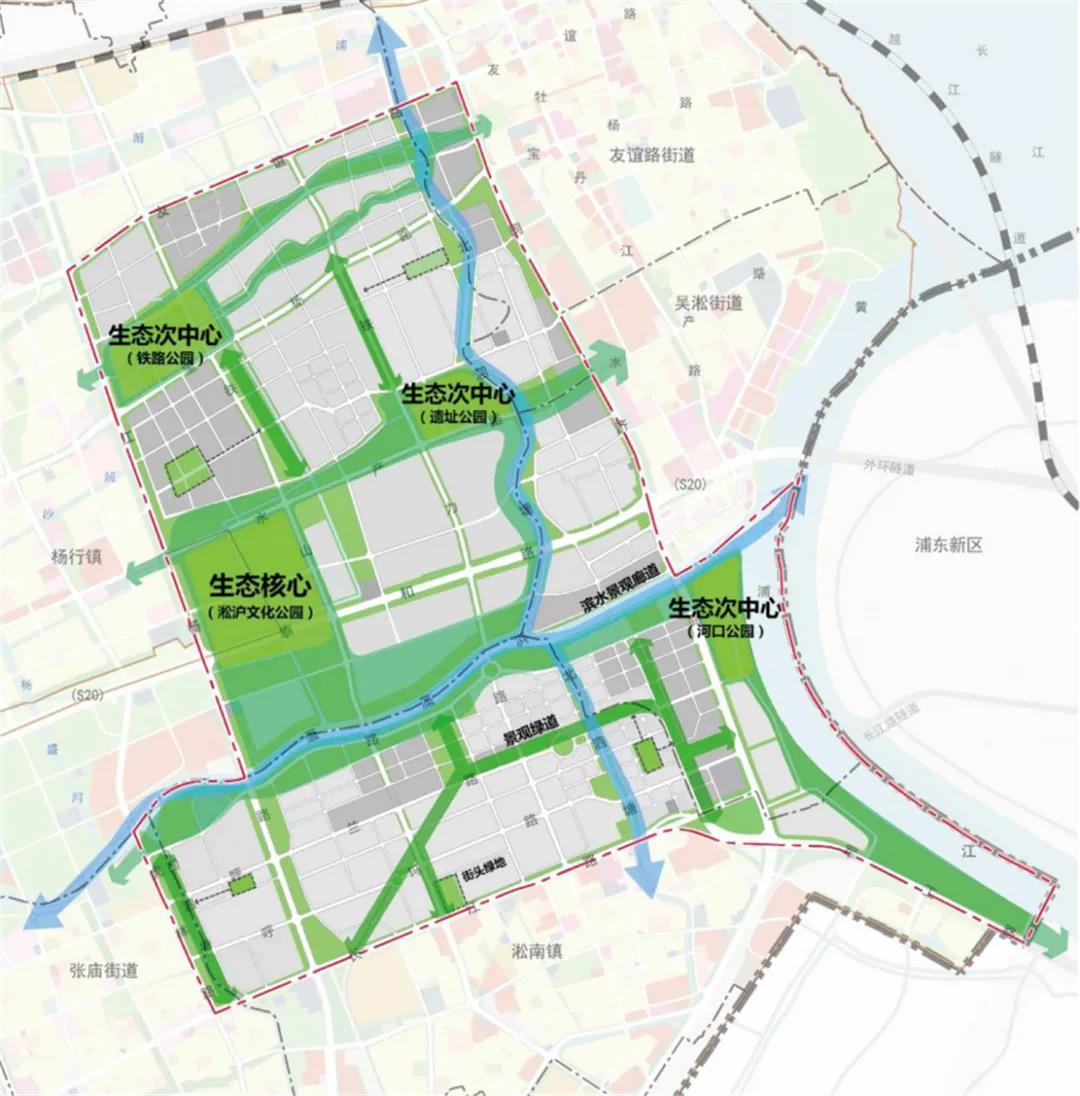 规划形成“一核两心、两带五区”的布局结构,强化吴淞创新城用地功能的多元复合、生态环境的可持续发展。“一核”即以吴淞大型城市生态公园为“绿核”,融入体育、文化、休闲、创意等综合功能;“两心”即枢纽商务中心(吴淞城市副中心)与滨江文化中心;“两带”即黄浦江与蕰藻浜岸线,形成两条集聚城市公共活动功能的活力走廊;“五区”即五大功能片区,包括围绕“两心”,形成两大综合配套服务区、结合宝武特钢地区转型形成前沿产业集聚区、结合宝武不锈钢地区转型形成科创文创产业集聚区、沿蕰藻浜北岸预留远期弹性发展的生态智慧发展区。