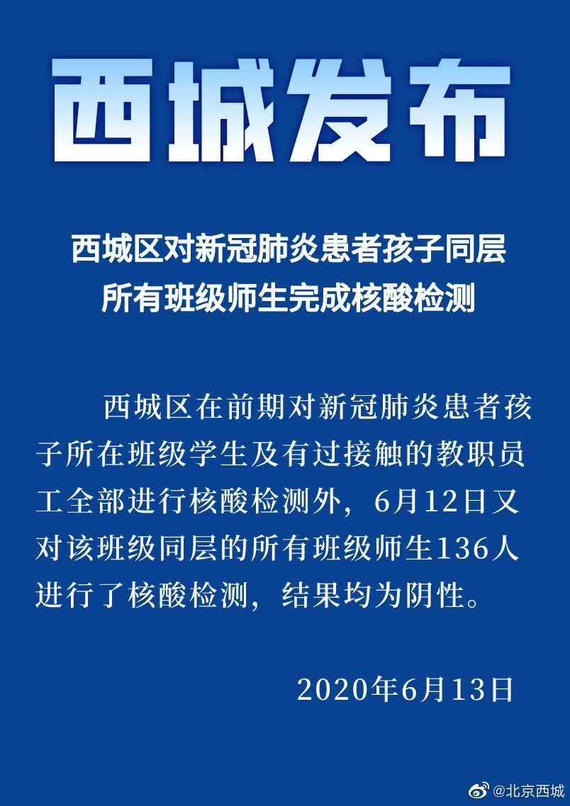 北京西城区在前期对新冠肺炎患者孩子所在班级学生及有过接触的教职员工全部进行核酸检测外,6月12日又对该班级同层的所有班级师生136人进行了核酸检测,结果均为阴性。
