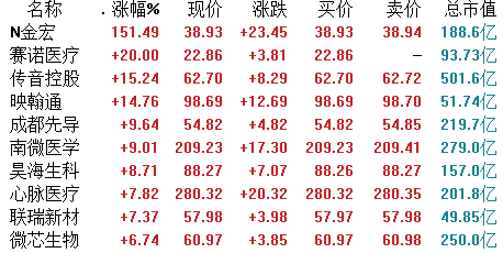 涨幅方面,新股金宏气体(688106.SH)涨幅达151.49%,赛诺医疗(688108.SH)涨停,传音控股(688036.SH)、映翰通(688080.SH)均涨逾14%,成都先导(688222.SH)、南微医疗等跟涨。