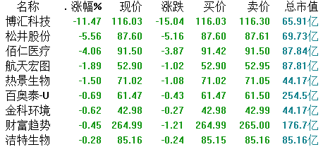 跌幅方面,博汇科技(688004.SH)跌逾10%,松井股份(688157.SH)跌逾5%,佰仁医疗(688198.SH)跌逾4%,航天宏图(688066.SH)、热景生物(688068.SH)等小幅跟跌。