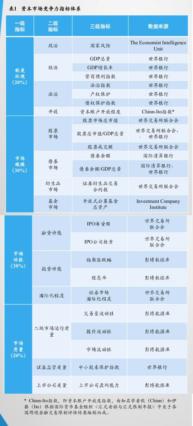 具体来看,《报告》围绕资本市场核心竞争力的构成要素,从制度环境、市场规模、市场功能和市场质量四个维度,构建评估全球资本市场竞争力的评价体系。