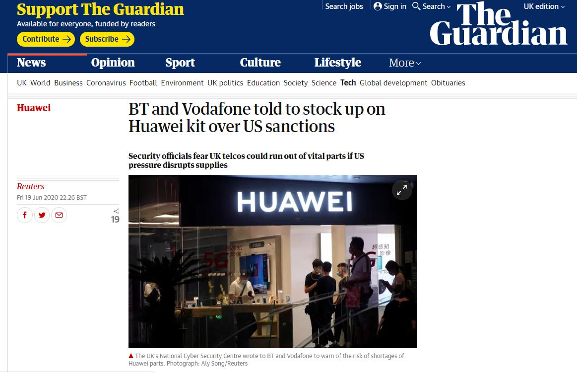 英国《卫报》6月19日援引路透社的报道称,由于担心美国的制裁会破坏华为公司维持关键供应的能力,英国安全官员已告知英国电信运营商,确保它们有充足的华为设备库存。