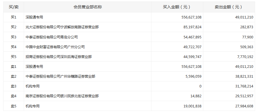 盘后数据显示,深股通买入5.57亿元并卖出4901万元,光大证券宁波解放南路买入8519万元,两机构卖出5975万元。
