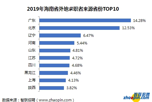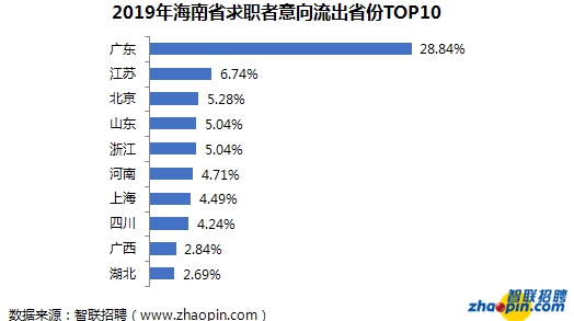 从外地求职者的来源地来看,2019年海南外地求职者中,14.28%来自广东,居首位。同时,广东也是海南省最大的人才流出地,2019年有意去外地发展的海南求职者中,有28.84%选择了广东,这一比例不但与位列第2的江苏省拉开22.1个百分点的差距,也高于第2位到第6位意向流出省份的总和,形成绝对优势。
