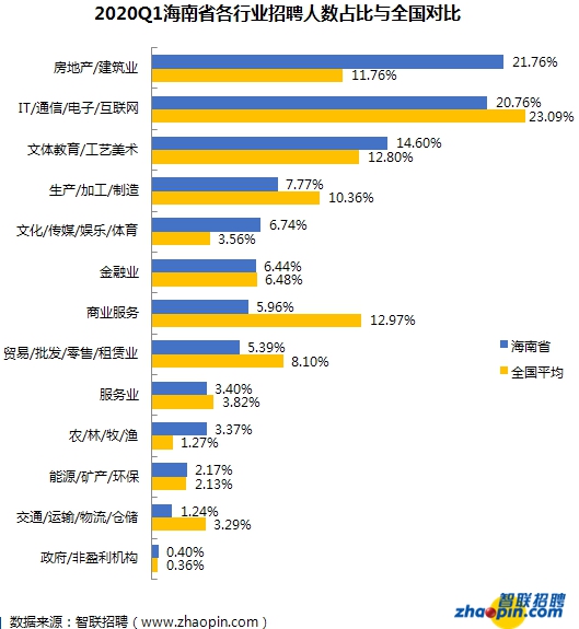 《报告》显示,通过2020年第一季度人才招聘的行业结构可以看出,海南省房地产/建筑业招聘人数占比最高,达21.76%,高于全国平均水平10个百分点,文体教育/工艺美术、文化/传媒/娱乐/体育行业的招聘人数占比也超过全国平均水平。