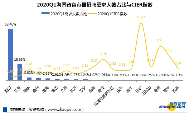 从海南省各市县的招聘需求来看,海口人才需求形成“一城独大”的态势,该市2018年第一季度释放了全省整体招聘市场44.45%的岗位机会,这一比例到今年一季度上涨至58.46%;同期三亚与儋州两座地级市的人才需求分别占18.65%和3.15%。也就是说,海口和三亚的人才需求占据了全省的八成。