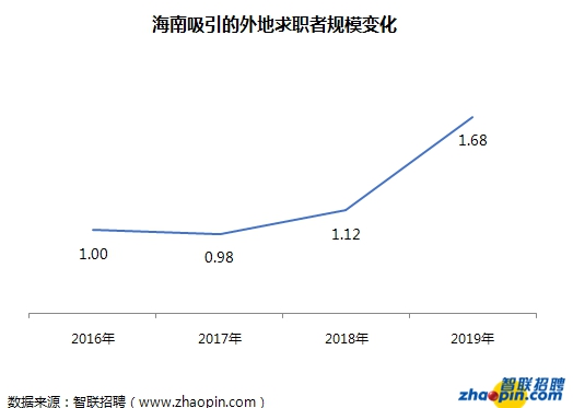 聚集人才的过程中,对外地人才的吸引力是一个重要指标。随着海南经济实力的提升、产业结构的优化,人才流向海南发展的信心明显加强。《报告》显示,以2016年为基数,2019年的求职者规模指数为1.68,表示向海南投递简历的外地人才3年增长68%,并且逐年人才流入的规模加速明显。