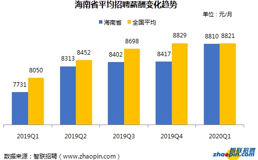 对人才吸引力的提升,也离不开收入、环境的改善。《报告》显示,2019年以来海南省的平均招聘薪酬逐季升高,2020年第一季度达到8810元/月,与全国平均水平(8821元/月)相近。