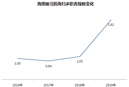 此外,近年来越来越多的海归人才选择了海南。海南吸引海归求职者的规模指数在2019年达到了1.92,较2016年近乎翻倍。