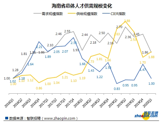 即使在疫情期间,全国人才供需规模收缩的背景下,今年一季度海南的人才供需规模依然是2016年一季度的近2倍。