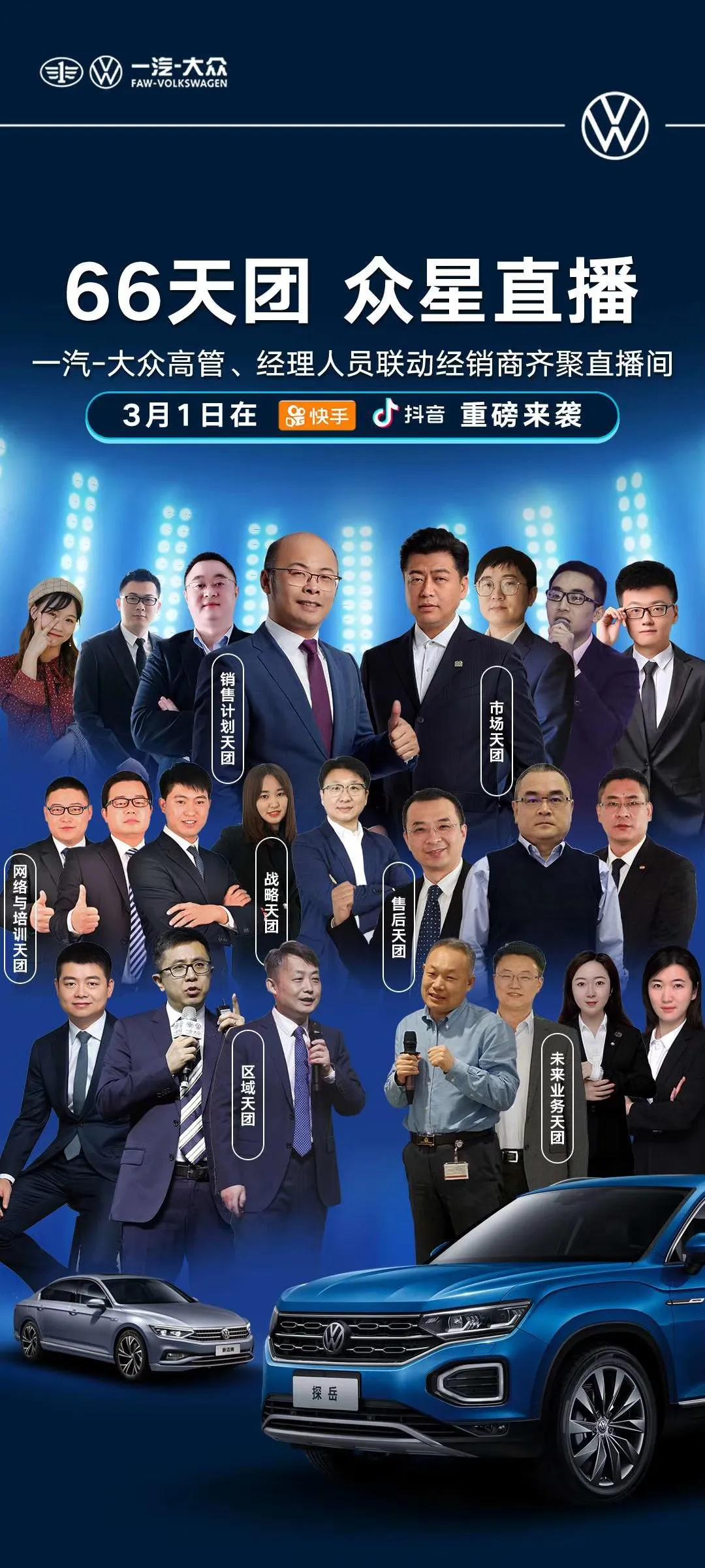 今年以来,一汽-大众大众品牌在线上营销方面就不断进行探索。其中,线上直播成为主要方式之一。2020年3月份,一汽-大众销售公司管理团队与经销商团队开启了线上直播“云看车”活动,此次直播活动一汽-大众一口气将主管营销、销售、售后服务、战略、区域营销等多个板块的高管以及区域管理、销售等66人全部动员起来,组成了“66天团”。来自一汽-大众的官方数据显示,此次直播累计观看量达40.6万人次,总点赞量112万次。其中,马振山自己的微博播放量就达134万次。