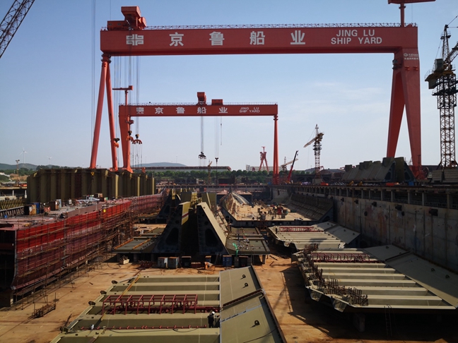 蓬莱西城临港工业区、长山列岛内侧,坐落着一家现代化大型船舶制造企业——蓬莱中柏京鲁船业有限公司。在6月的阵阵海风中,5000多名工人紧张而有序地忙碌着。