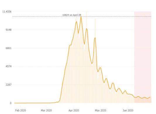 欧洲经历巨大的波峰后,新发病例已经在底部维持了快2个月,有压下去的感觉。美国虽在5月份露出压平的迹象,却在6月份重新转头向上,画出了弯弯的曲线,好比狰狞的微笑。