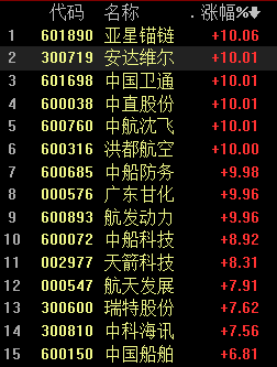 7月9日,国防军工板块延续昨日强势表现,截至发稿,亚星锚链、中国卫通、中航沈飞、洪都航空、中船防务等集体涨停,中船科技、天箭科技涨超8%。