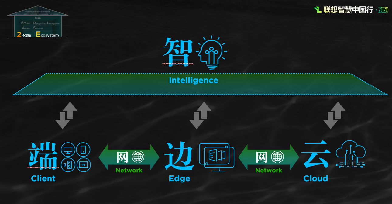 RISE战略中的RI(Range-wide Intelligence)代表全域智能化,S(Service)代表服务,E(Ecosystem)指生态系统,它由2个基础,4类服务和6+领域组成。联想中国智能化服务战略RISE,就是依托“端边云网智”新一代技术架构和智能化服务生态联盟两大基石,通过设备服务、智能运维服务、智慧解决方案、智能化全周期服务这4类服务,满足多领域行业客户智能化升级的需求。