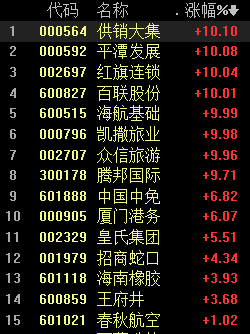 7月10日午后,免税店概念股持续走强,中国中免一度涨逾9%,截至发稿,供销大集、平潭发展、红旗连锁、百联股份、凯撒旅游等多股涨停,中国中免、厦门港务涨逾6%。