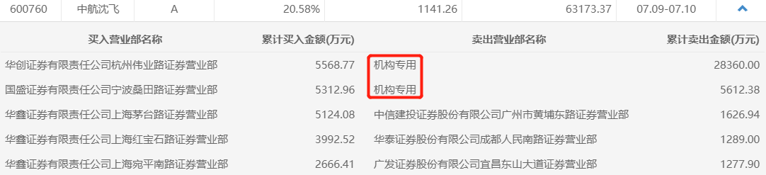 在卖出排行榜上,机构卖出最多的中航沈飞有2家机构进行了卖出,净卖出金额33972.38万元。