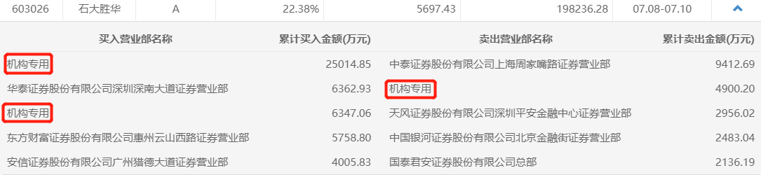 从详细数据看,机构今日净买入最多的石大胜华有2家机构买入,1家机构卖出,净买入金额26461.7万元。