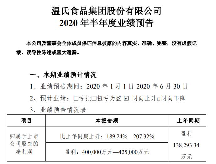 温氏股份7月13日晚间发布公告显示,预计今年上半年净利润为40亿元-42.5亿元,同比增长189.24%-207.32%。