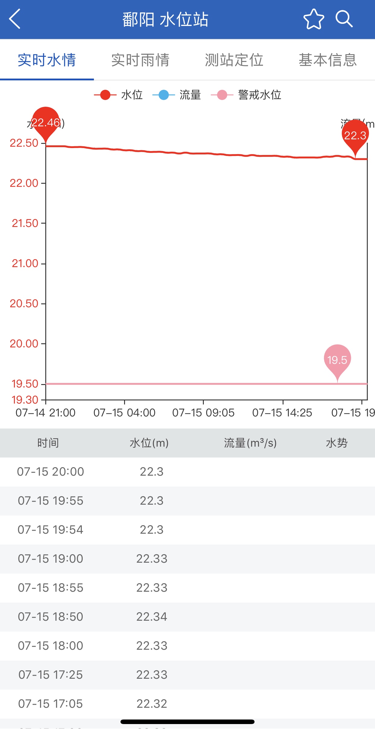 截至7月15日20时,鄱阳水位站水位22.3米,相较12日7时的22.75米下降了0.45米,已低于1998年极值的22.61米,不过仍高出警戒水位(19.5米)2.8米。