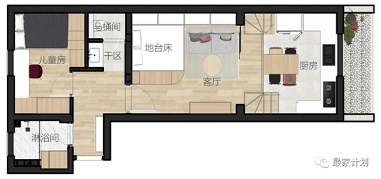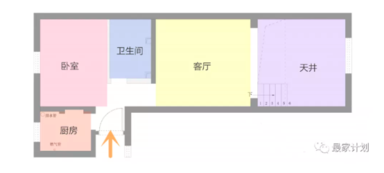 ☆ 原有厨房偏小,冰箱无处放置,北卧较小,卫生间空间一般,南卧面积尚可,天井利用率较低,连接南卧及天井的楼梯使用非常不方便。