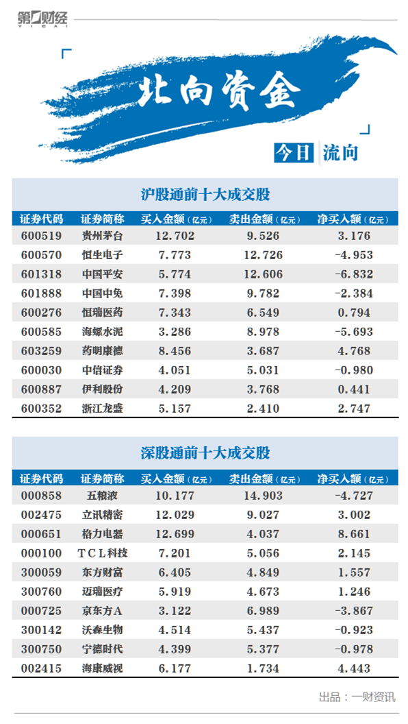 中国平安遭净卖出6.83亿元居首,海螺水泥、恒生电子分别被净卖出5.69亿和4.95亿元;格力电器逆势获净买入8.66亿元,药明康德、海康威视获净买入逾4亿元。