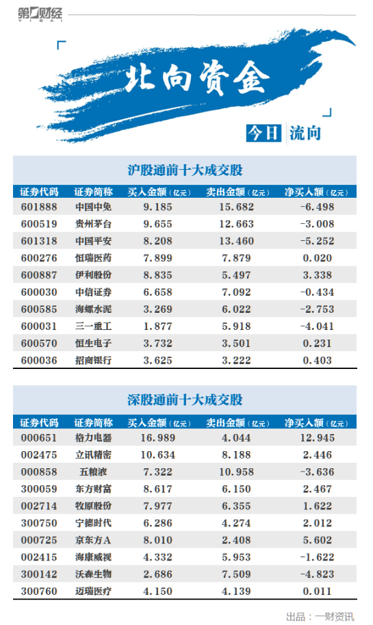 格力电器获净买入12.94亿元居首,京东方A和伊利股份分别获净买入5.6亿元和3.34亿元,中国中免遭净卖出6.5亿元,中国平安和沃森生物分别被净卖出5.25亿和4.82亿元。