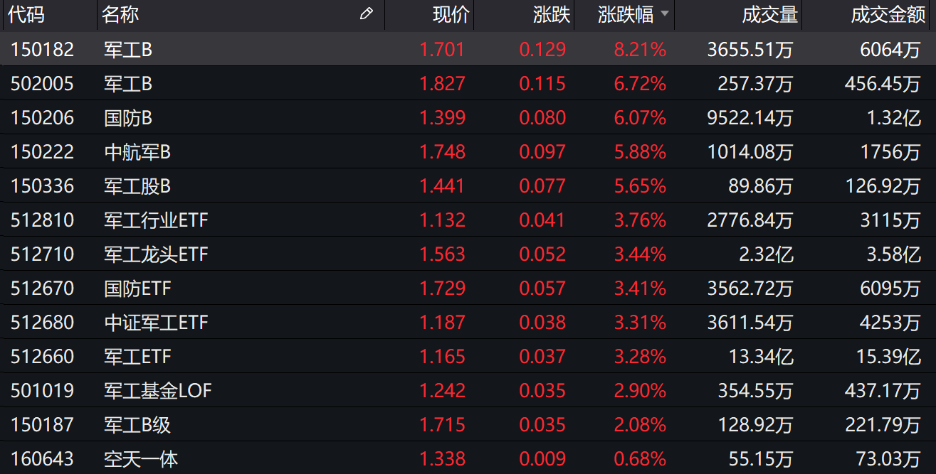 除此之外,昨日回调的军工板块今日再度卷土重来,北斗导航概念集体走高,北斗星通(002151.SZ)、航锦科技(000818.SZ)、北方导航(600435.SH)等多只个股涨停,申万国防军工板块以4.03%的涨幅位居申万一级行业涨幅榜第一名。场内军工主题基金表现不俗,军工B(150182.SZ)涨幅超8%,国防B(150206.SZ)涨幅超6%。