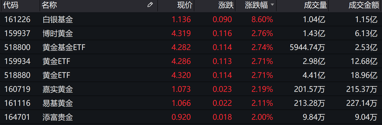 上述相关主题的场外基金有:汇添富黄金及贵金属(164701.OF)、嘉实黄金(160719.SZ;160719.OF)、易方达黄金ETF联接C(002963.OF)、鹏华中证国防(160630.OF)、易方达军工(502003.OF)、富国中证军工(161024.OF)等。
