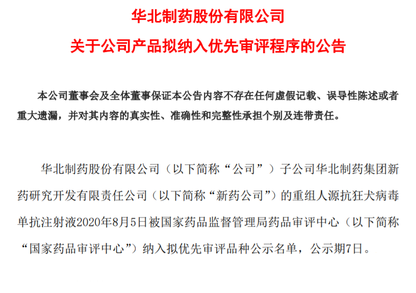 华北制药8月5日发布公告称,子公司新药公司的重组人源抗狂犬病毒单抗注射液,被国家药品审评中心纳入拟优先审评品种公示名单。该药已取得III期临床试验报告,国家药品审评中心受理了其注册申请。