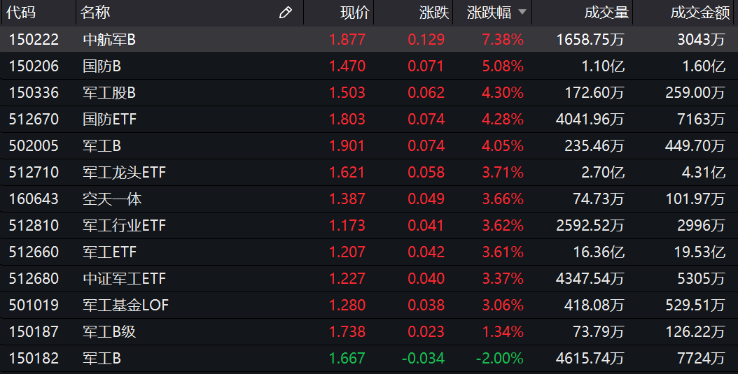 昨日反弹的军工板块今日再度强势拉升,航天航空、通用航空、航母概念、大飞机等军工相关概念板块涨幅居前,申万国防军工板块涨幅为4.18%,在申万一级行业涨幅榜中排名第一,且涨幅远高于第二位的非银金融。场内绝大多数军工主题基金上涨,其中,中航军B(150222.SZ)涨幅超过7%,国防B(150206.SZ)涨幅超过5%。